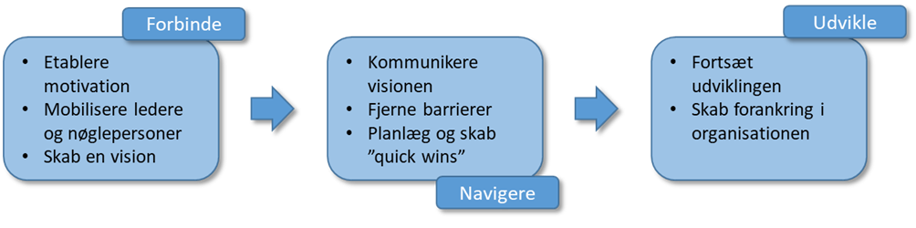 * Skabe en stærk forandringskultur, hvor medarbejderne ikke blot accepterer forandringen, men aktivt bidrager til dens succes